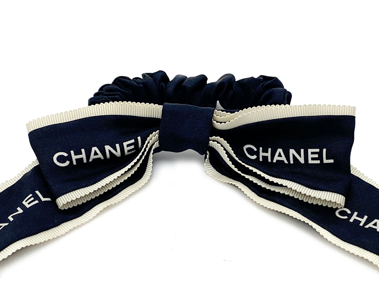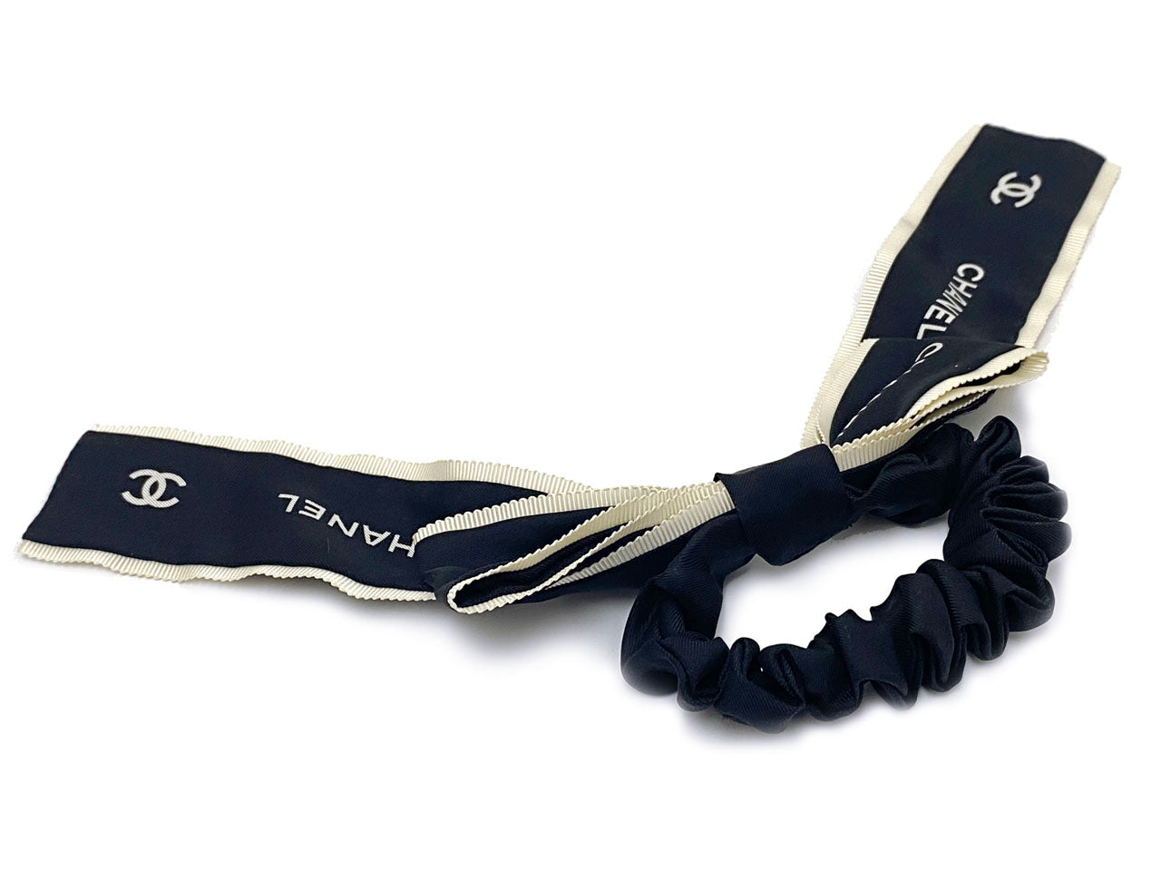 今回入荷したお品は、一目でシャネルと分かるロゴマークが描かれたリボンデザインのシュシュです。