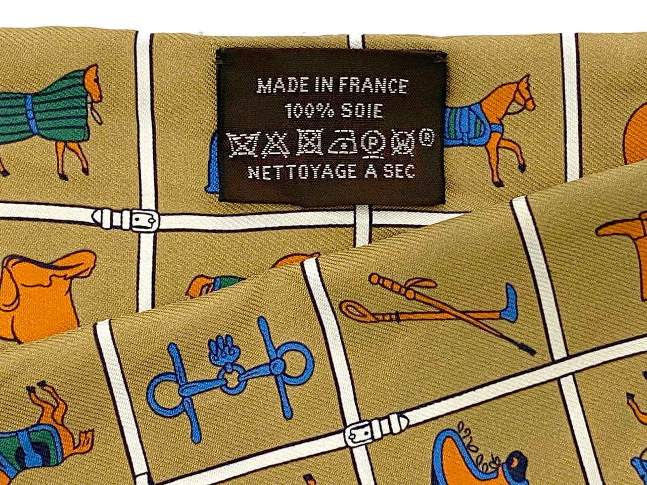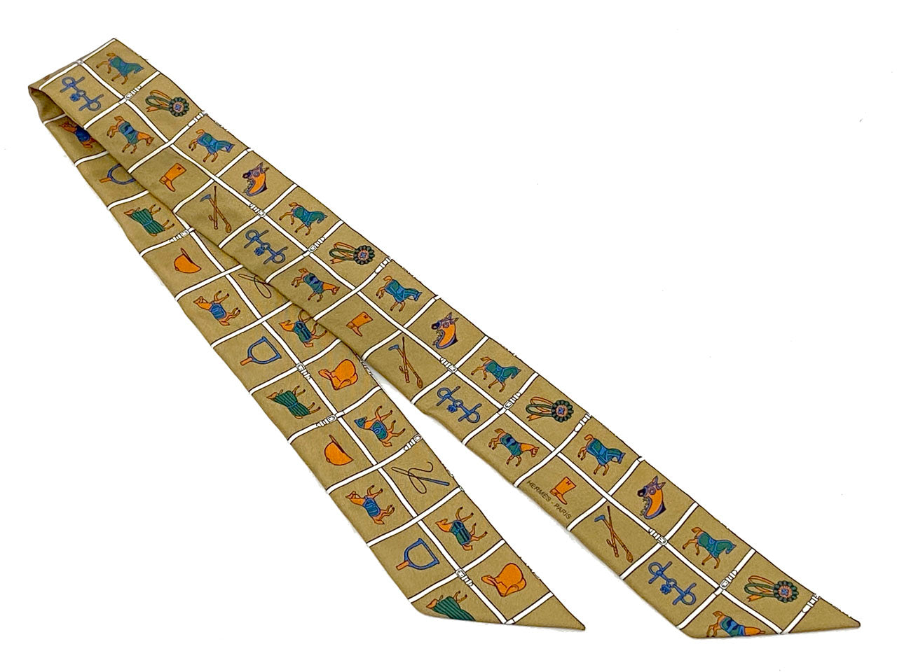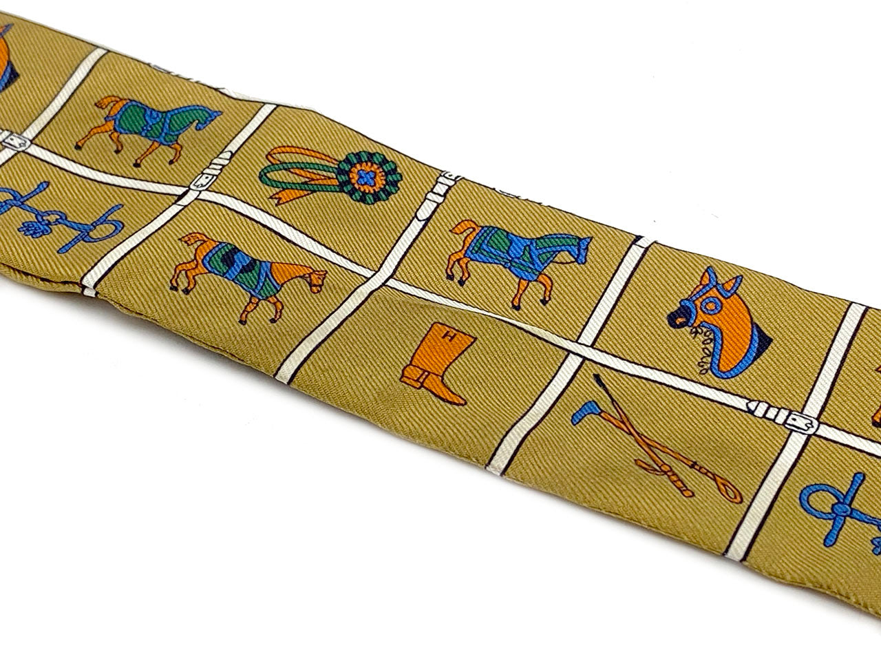 今回入荷したお品は、馬具の一つである被服を着用した様々な馬や馬具を描いた「馬着」とネーミングされるエルメスらしさ溢れるデザインのツイリー。