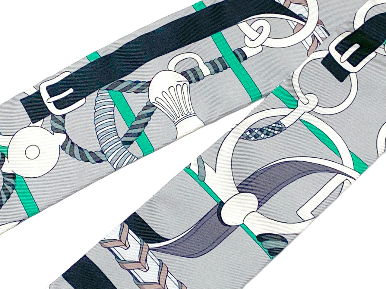 今回入荷したツイリーは、【乗馬の装具一式】とネーミングされた絵柄で、エルメスらしく様々な馬具がモチーフに描かれます♪