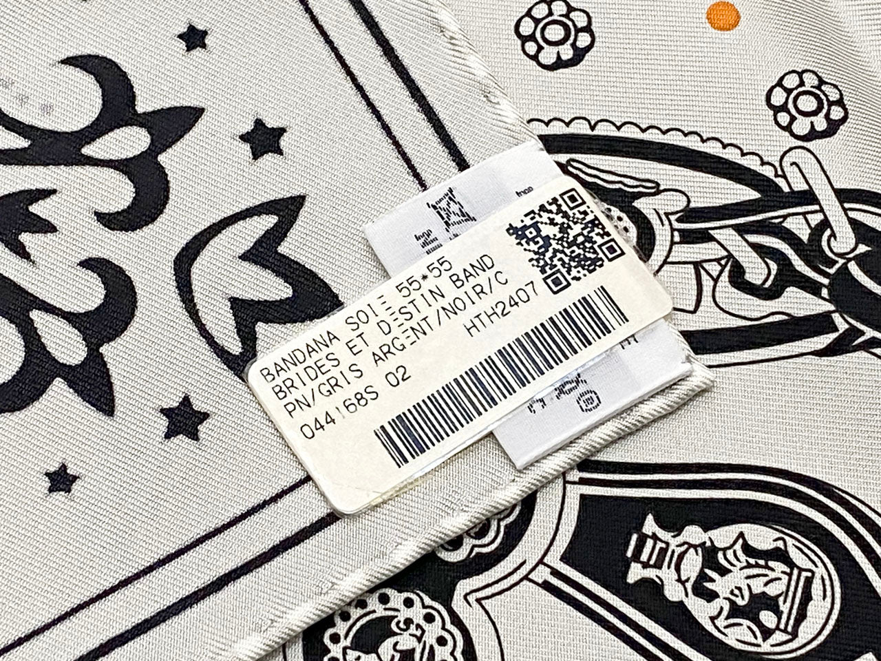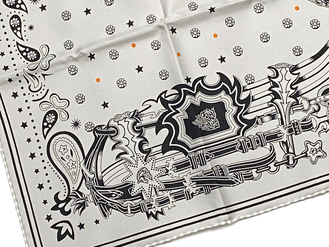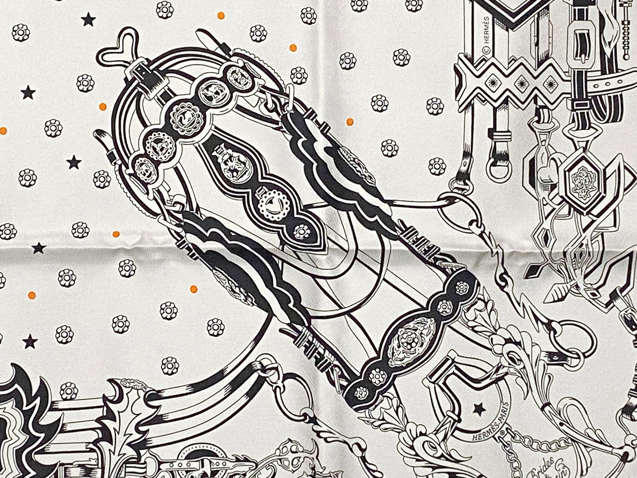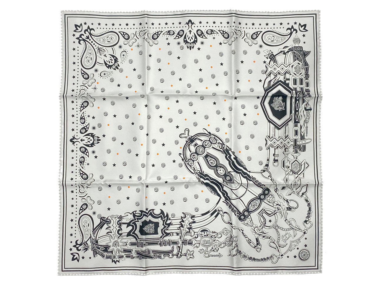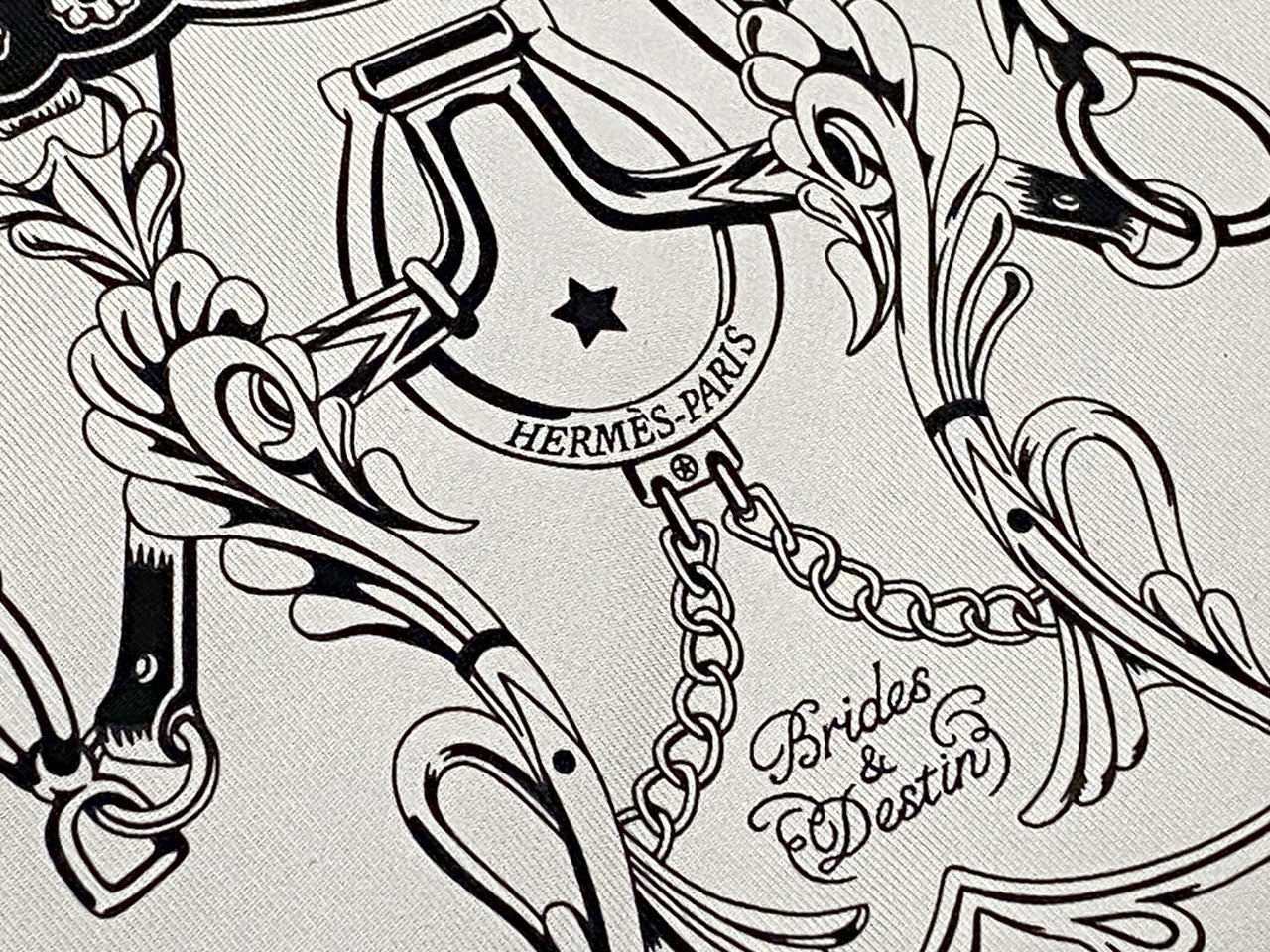 今回入荷したお品は、「ブリッド・エ・デスタン・バンダナ(馬勒と運命)」と題される、エルメスらしさ溢れる絵柄を描いた55cmバンダナです。