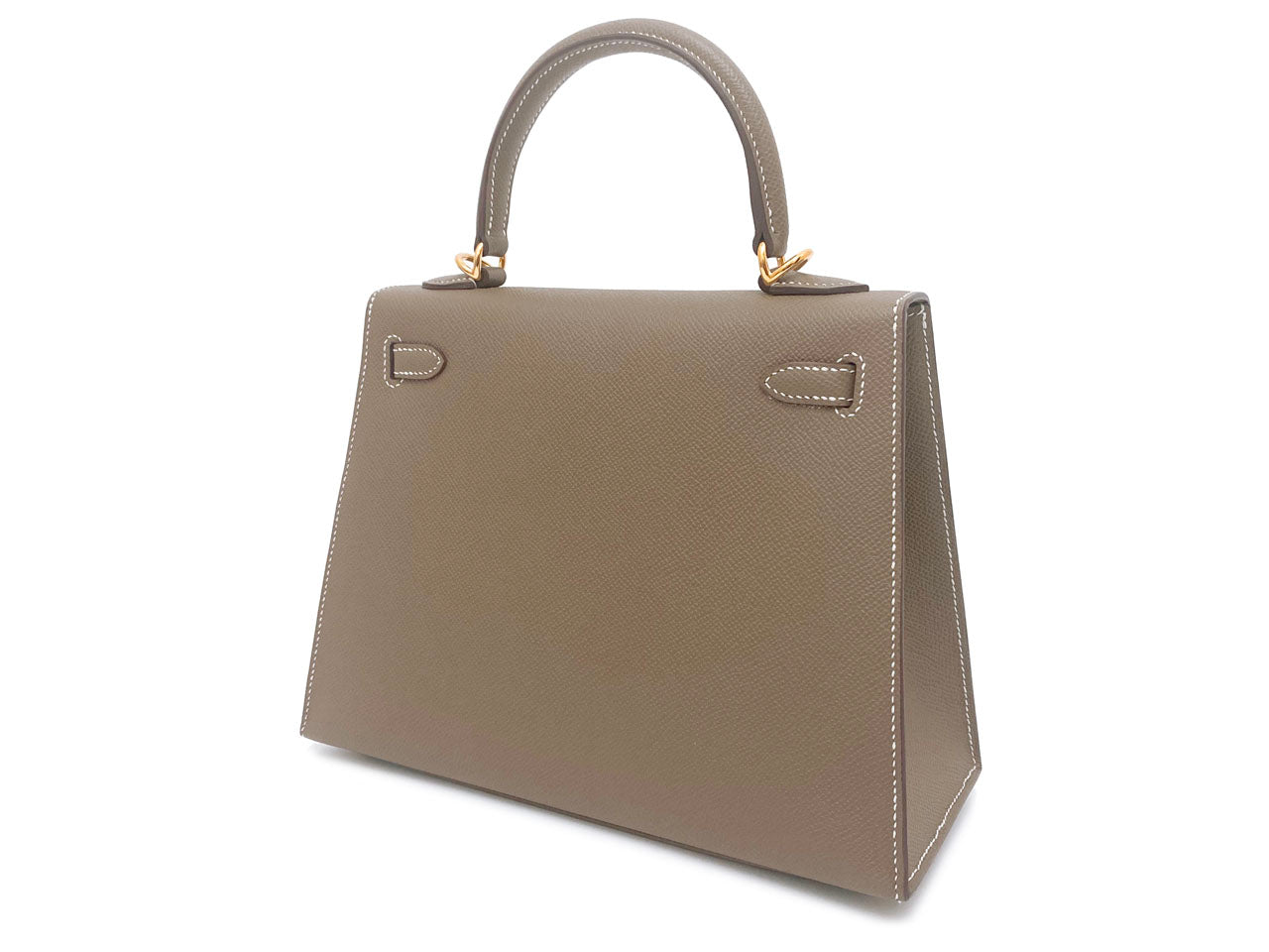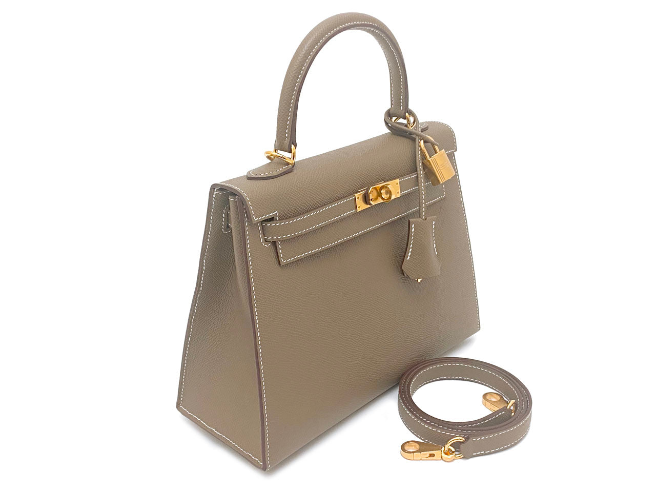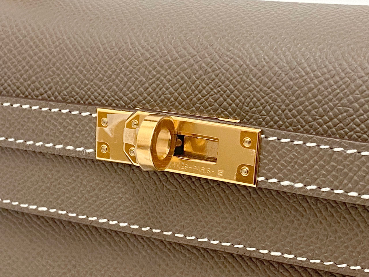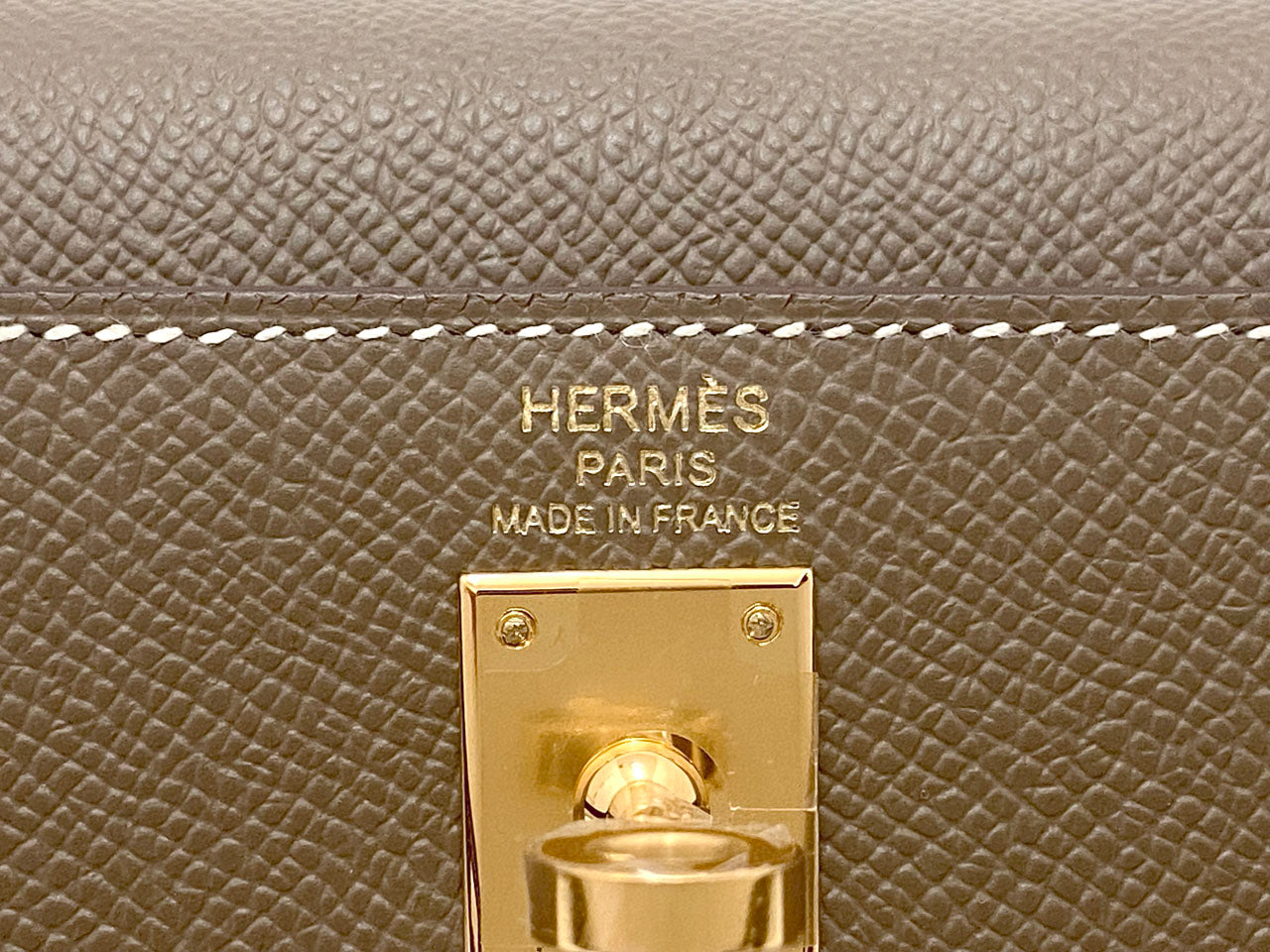 その可愛い小ぶりなサイジングがアピールポイントの25cmサイズのケリーですが、人気のレアカラー、“エトープ”にゴールド金具の金具のカラーリングになれば、グッと華やかでエレガントな印象。 さらに外縫い仕上げの組み合わせはケリー本来の“キッチリ感”も申し分なく兼ね備えている点も見逃せないポイントです。