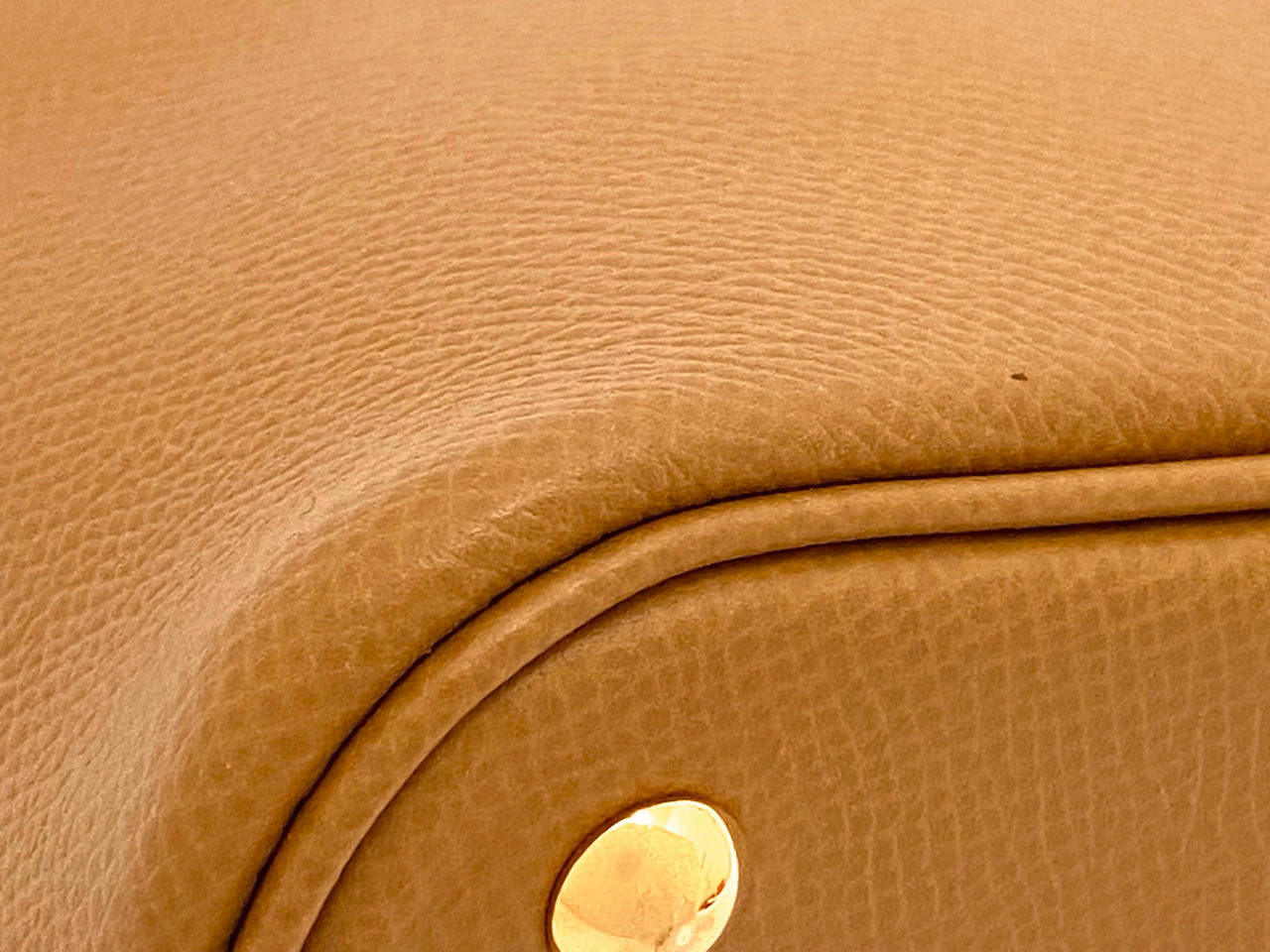 使用される素材は、適度な「張り感」とその軽さが魅力の細かめの型押し素材「ヴォー・エプソン」でいつまでも型崩れの心配も無くにはお勧めの素材で、いつまでも素材の表情が変わりにくく永くお使いいただくには最適な素材の一つです。