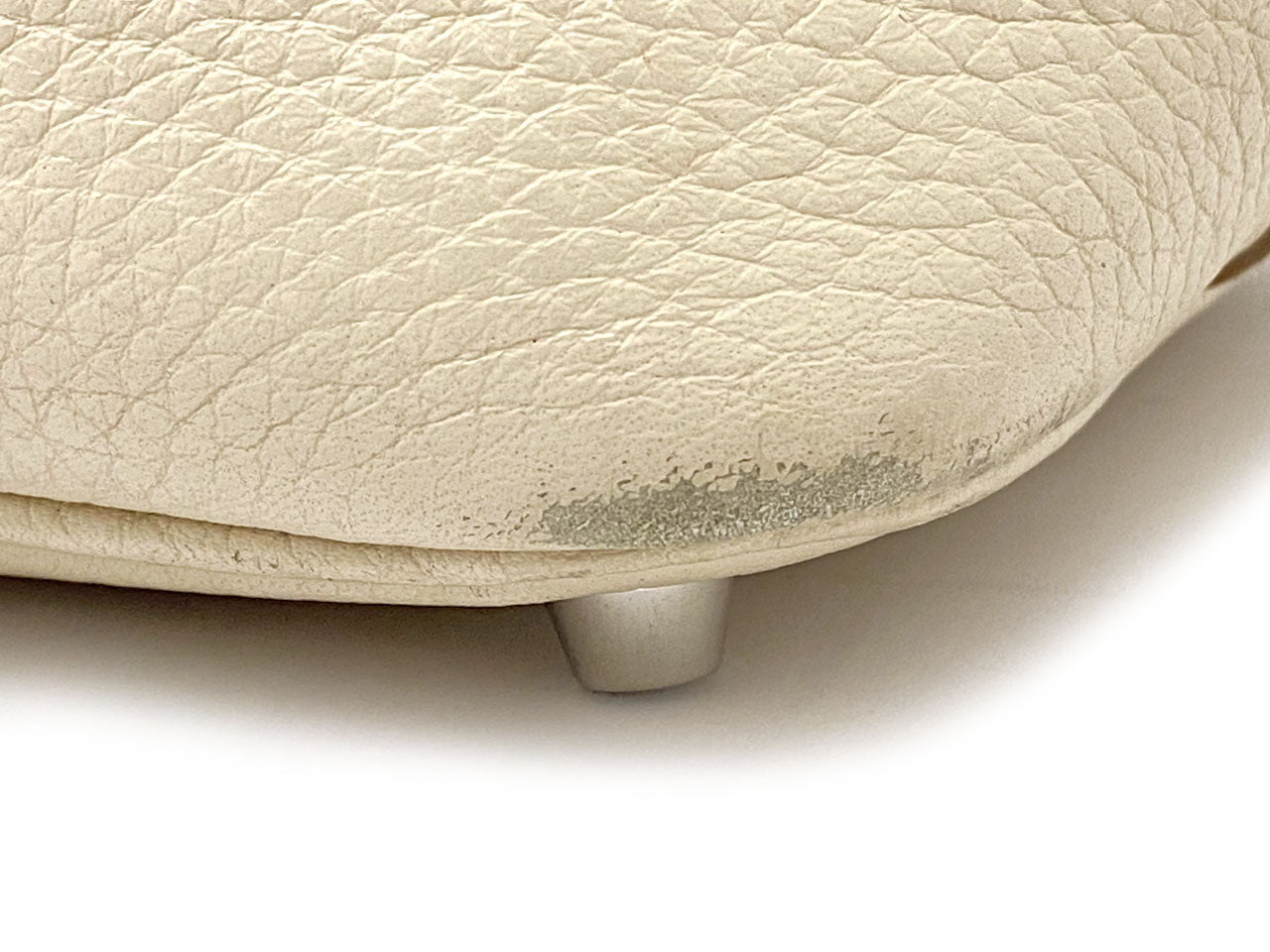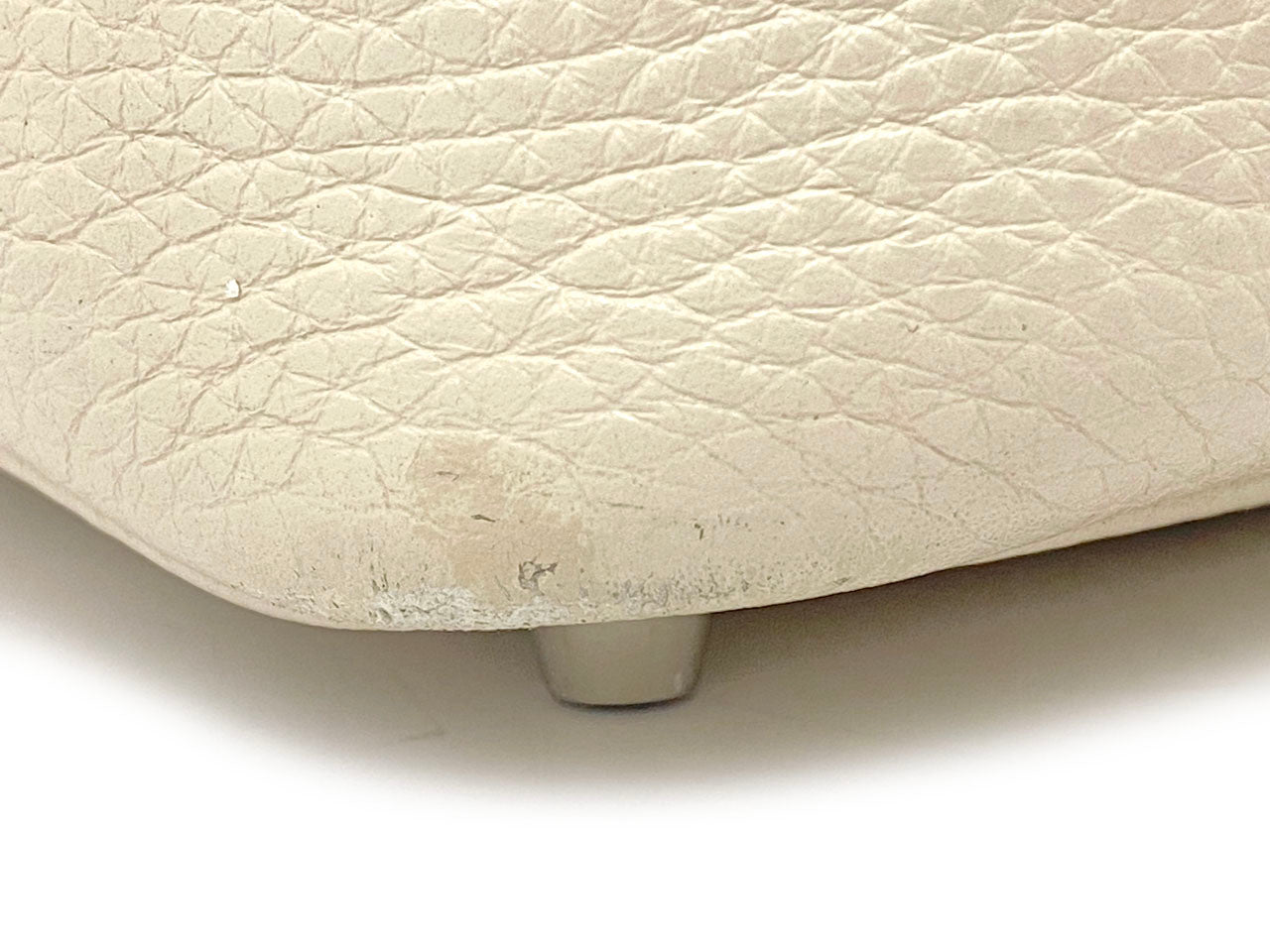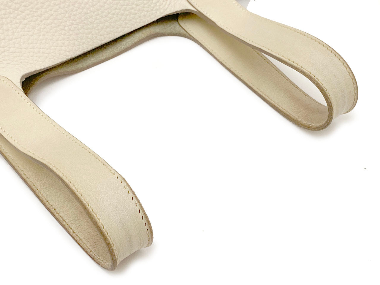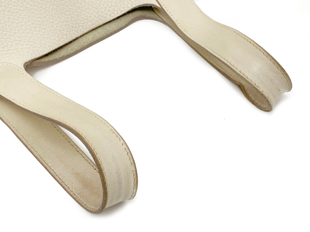 お色はややベージュ系のオフホワイトカラー「クレ」。使用される素材は本体に柔軟性のある型押し素材「トリヨンクレマンス」、ハンドルには凹凸の無い滑らかな肌触りの「ヴォー・スイフト」を使用。傷も目立ちにくい使い勝手のよい素材でコンディションの変化が現れにくいのが特徴です。