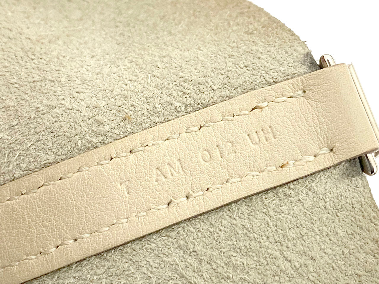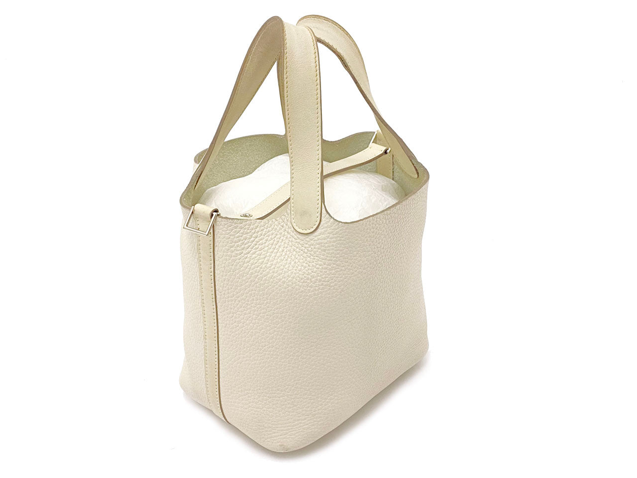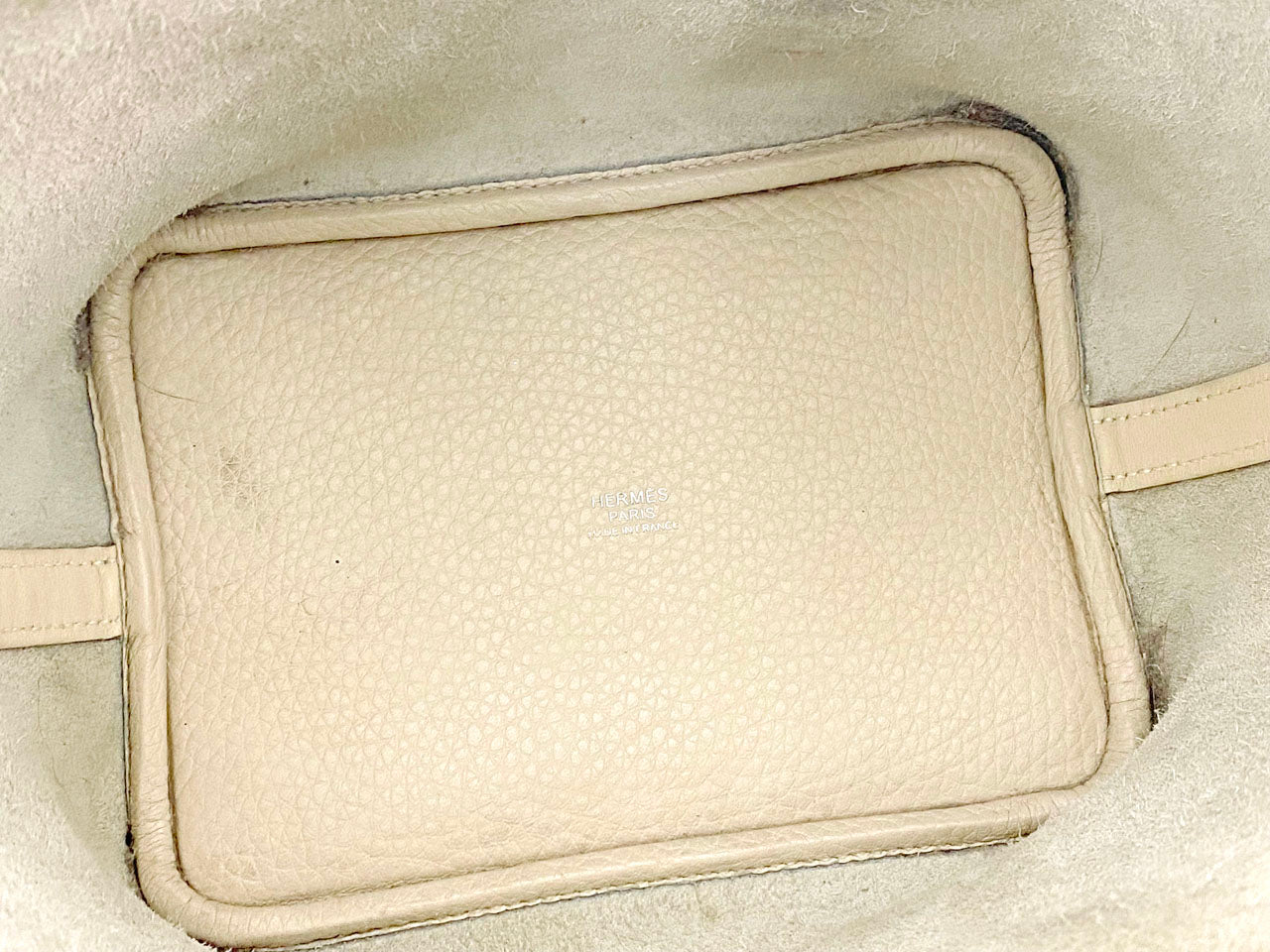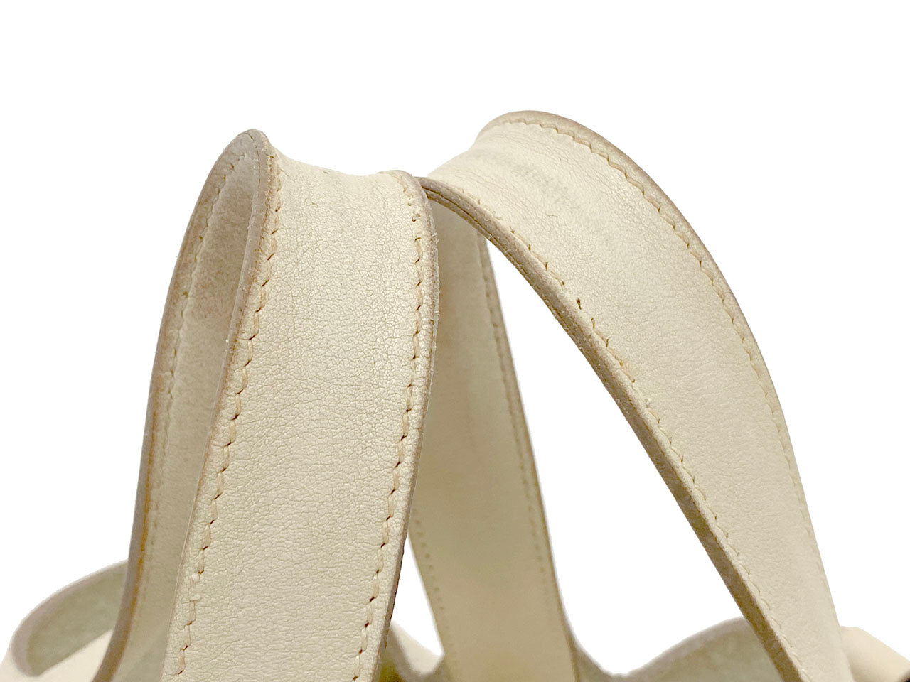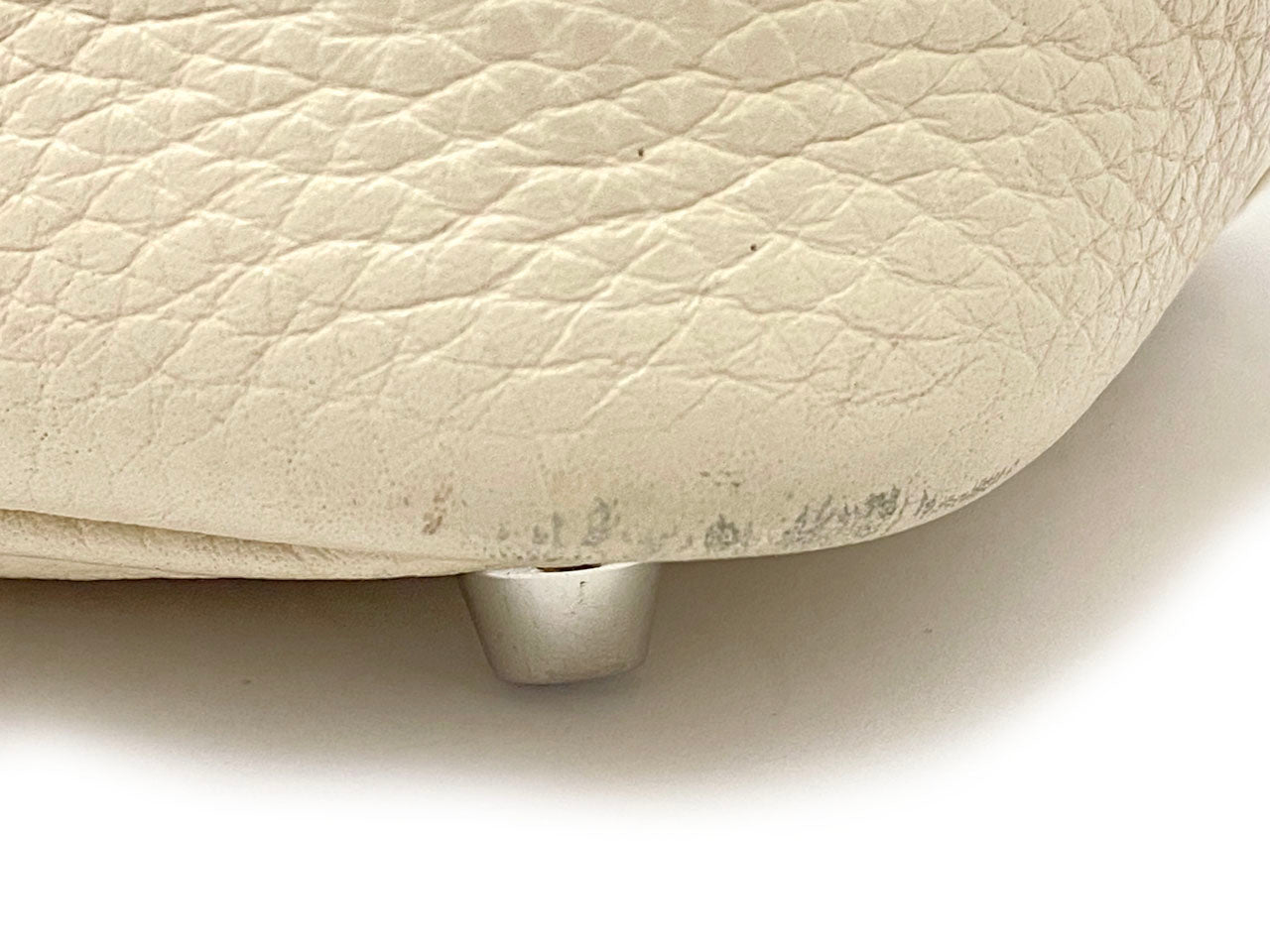 お色はややベージュ系のオフホワイトカラー「クレ」。使用される素材は本体に柔軟性のある型押し素材「トリヨンクレマンス」、ハンドルには凹凸の無い滑らかな肌触りの「ヴォー・スイフト」を使用。傷も目立ちにくい使い勝手のよい素材でコンディションの変化が現れにくいのが特徴です。