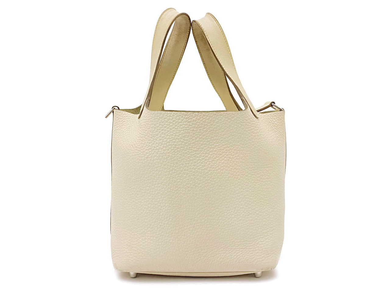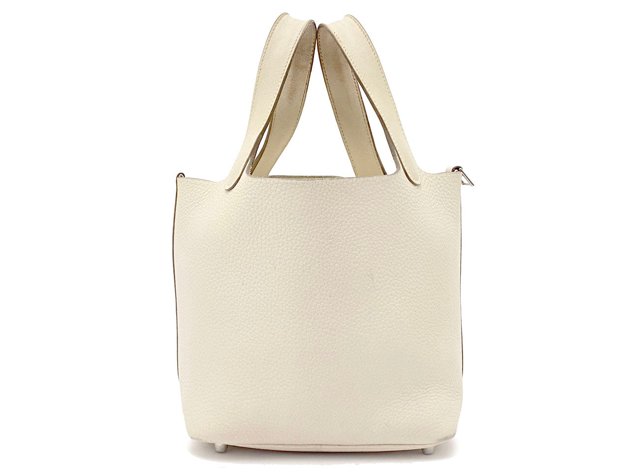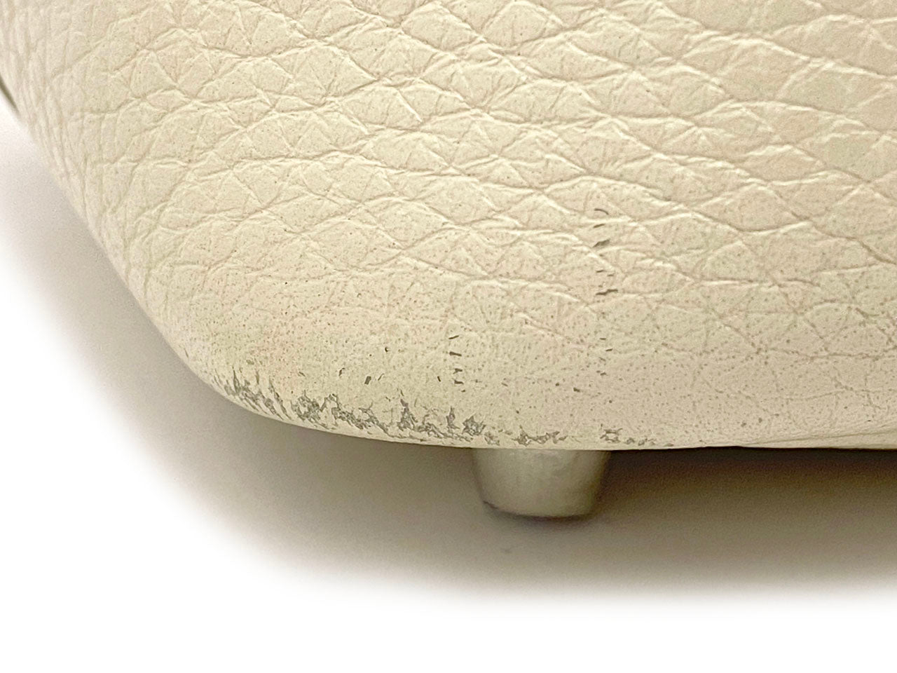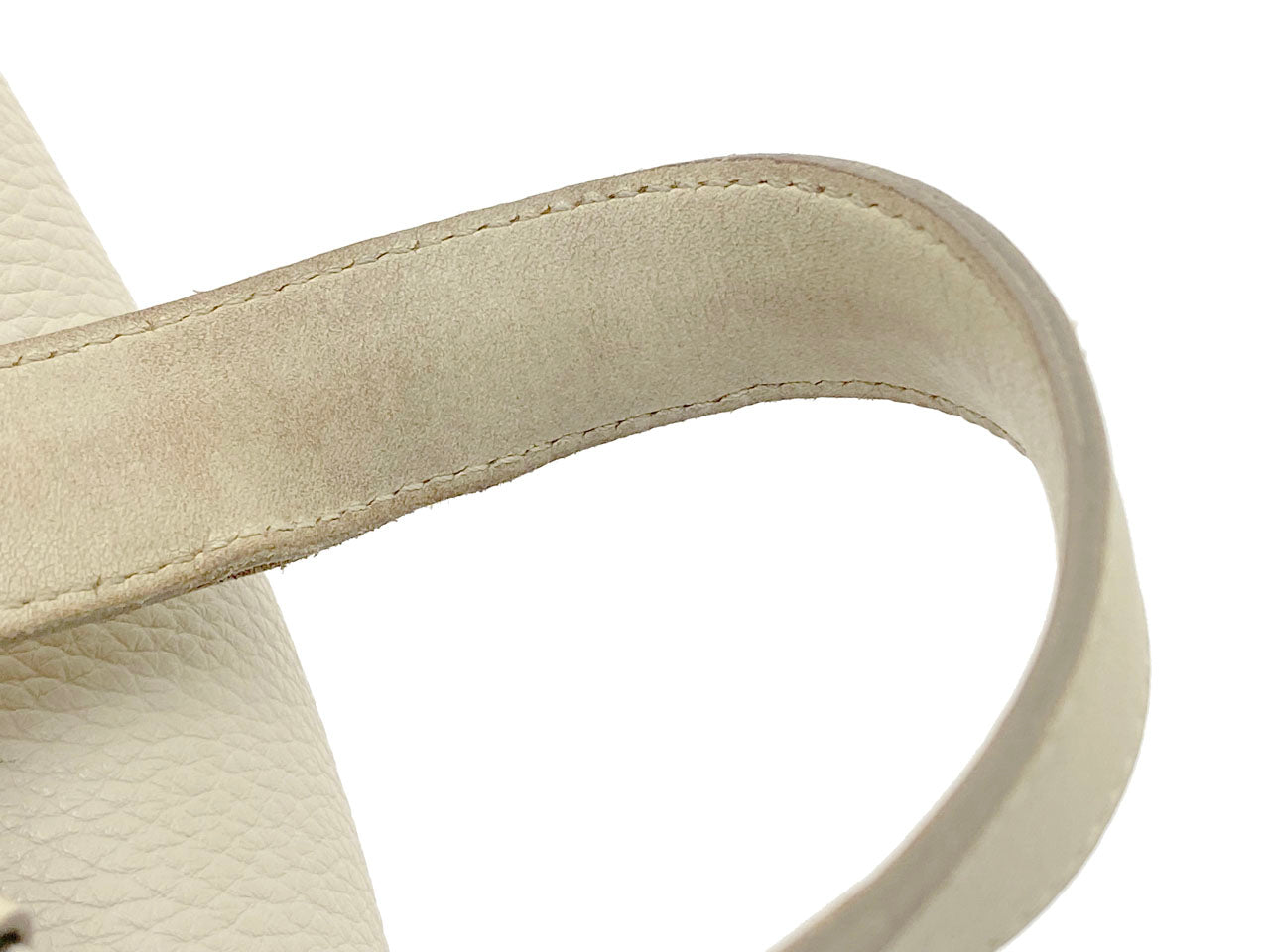 お色はややベージュ系のオフホワイトカラー「クレ」。使用される素材は本体に柔軟性のある型押し素材「トリヨンクレマンス」、ハンドルには凹凸の無い滑らかな肌触りの「ヴォー・スイフト」を使用。傷も目立ちにくい使い勝手のよい素材でコンディションの変化が現れにくいのが特徴です。
