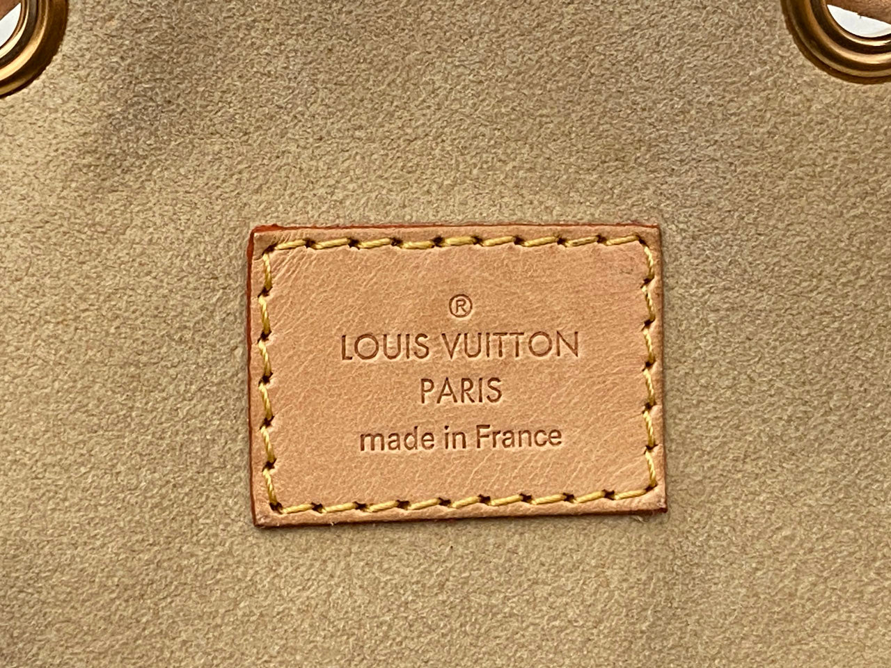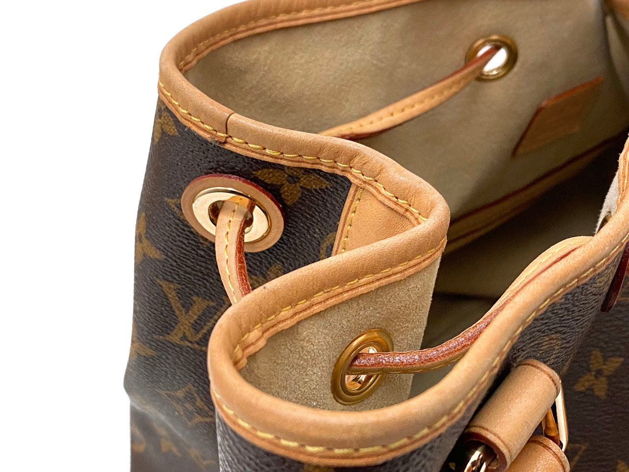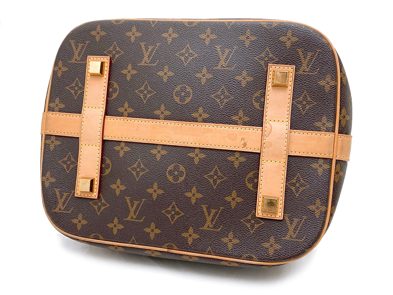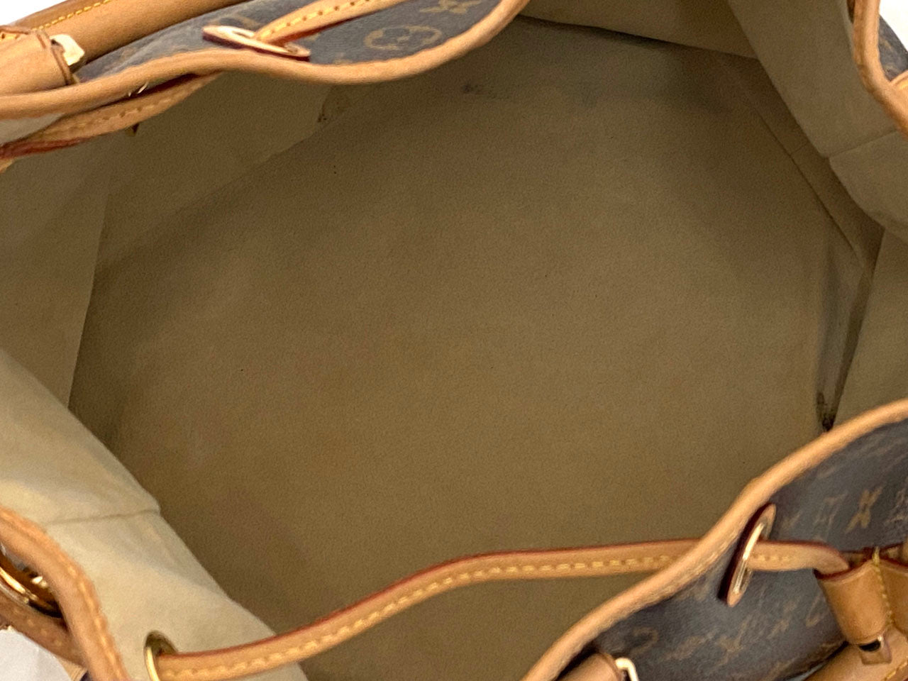 こちらのお品はリサイクルでの入荷となり、ヌメ革のヤケやシミ汚れと内側の汚れ、モノグラムレザーのうっすらとしたベタつきが感じられるお品となっております。