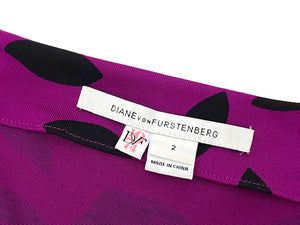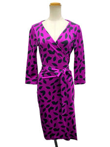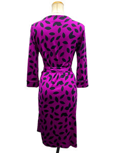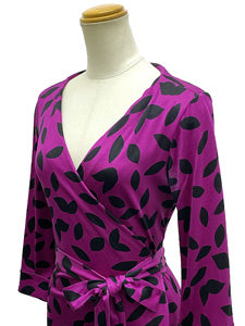 ダイアンフォンファステンバーグの中でも大人気のラップワンピース。パープルカラーをベースに、ブラックのリーフ柄が描かれた大胆な模様と、深めのVネックラインがエレガントな女性を演出する逸品。身体に程よくフィットして美しい身体のラインを描くフェミニンでエレガントなワンピースです。
